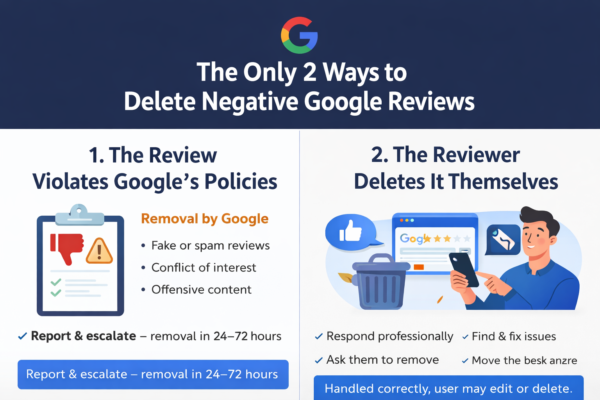 Google Reviews Read Article Apr 13, 2026 2 min read The Only 2 Ways to Delete Negative Google Reviews When it comes to removing negative reviews from Google, there’s a lot of misinformation online.…